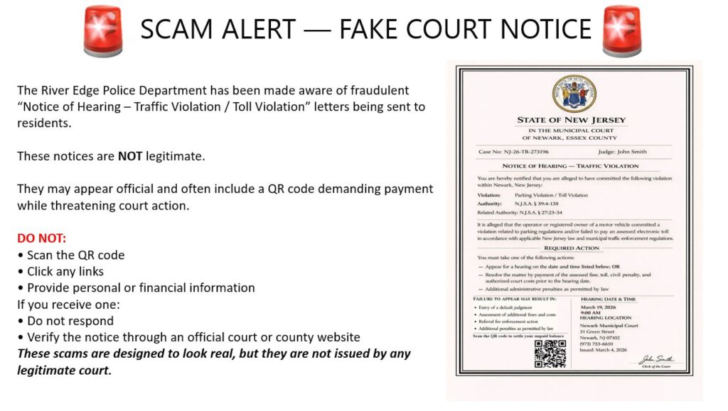 The River Edge Police Department is warning residents of scams involving text messages falsely portraying the New Jersey Motor Vehicle Commission and the New Jersey Courts.